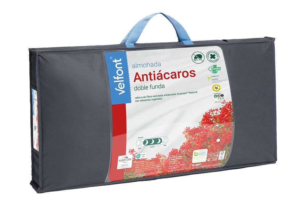 La Almohada Antiácaros de Velfont® es perfecta para quienes buscan comodidad, higiene y protección. Con doble funda 100% algodón y relleno de fibra hueca conjugada tratada con Acarsan® Natural, esta almohada ofrece un descanso fresco, suave y seguro, especialmente indicada para personas con sensibilidad a los ácaros del polvo.