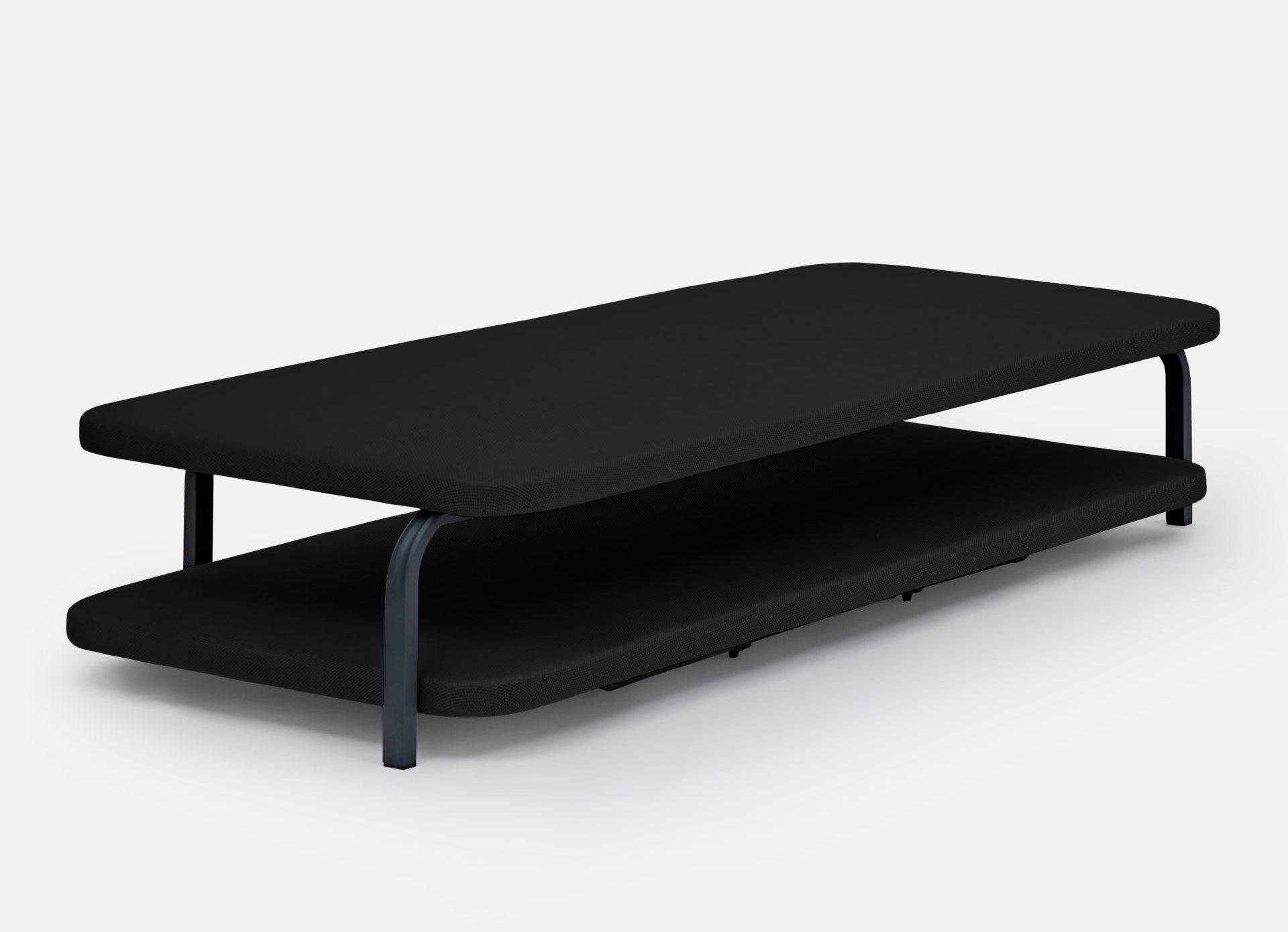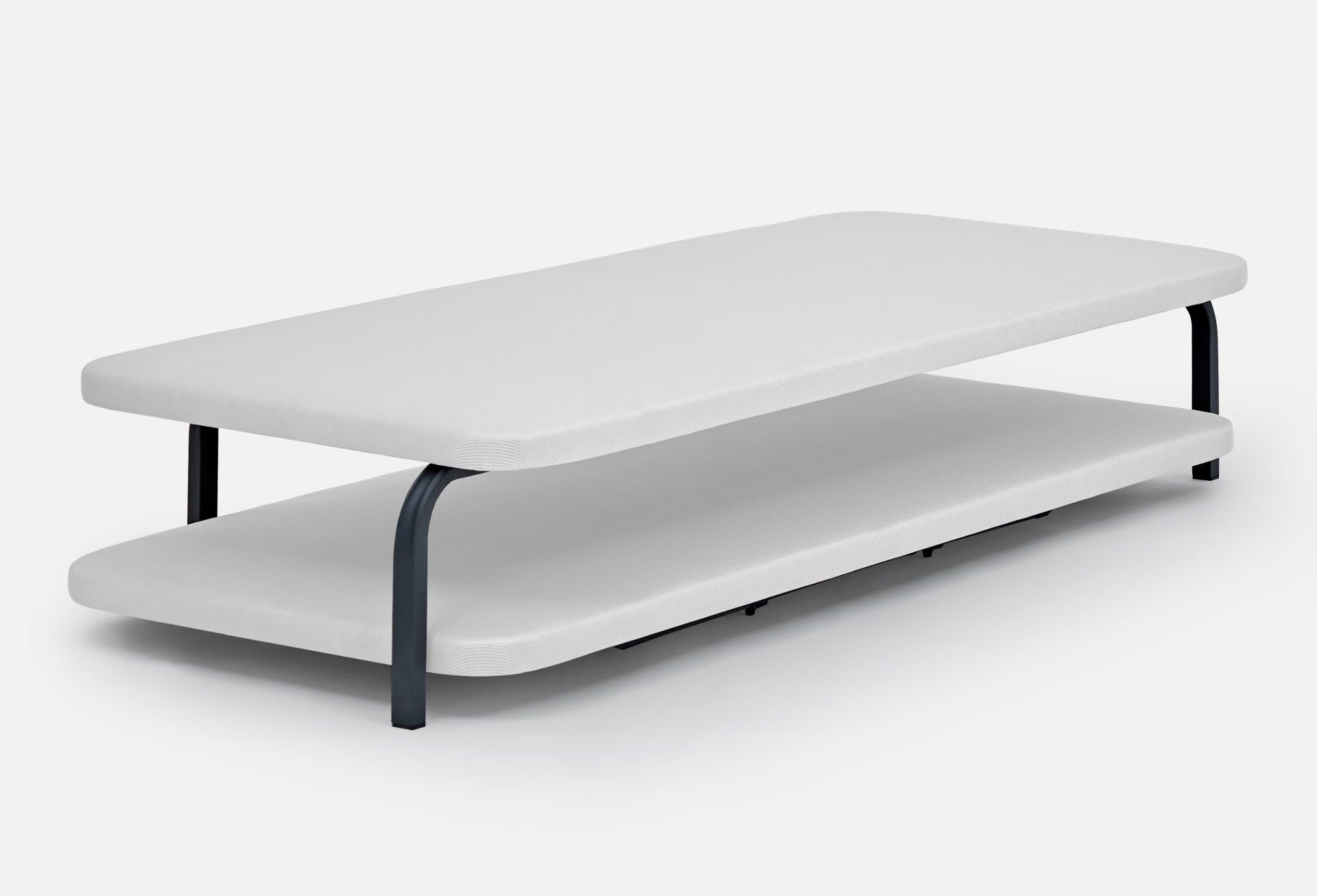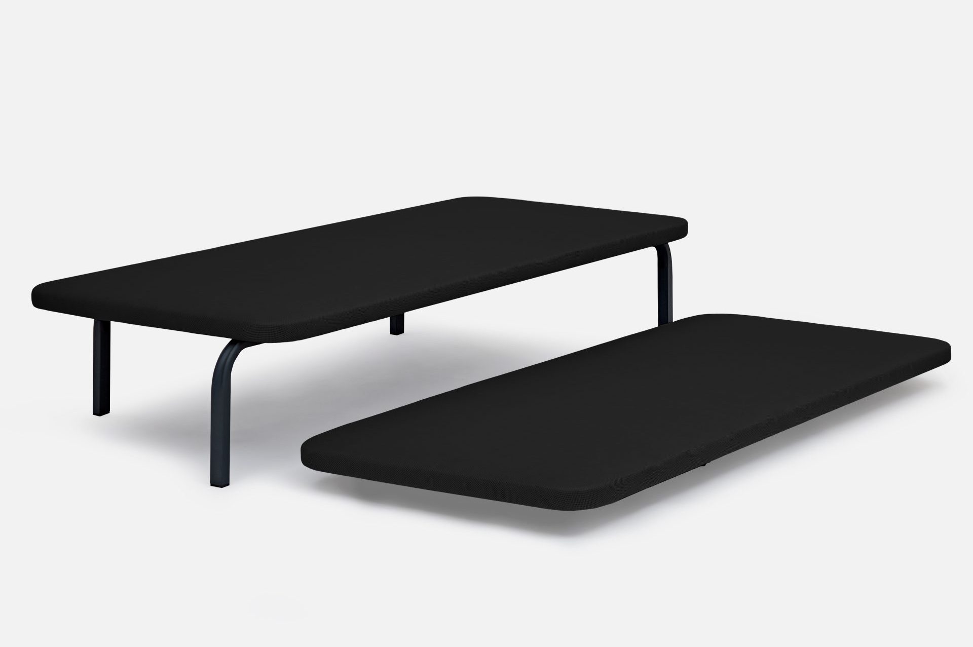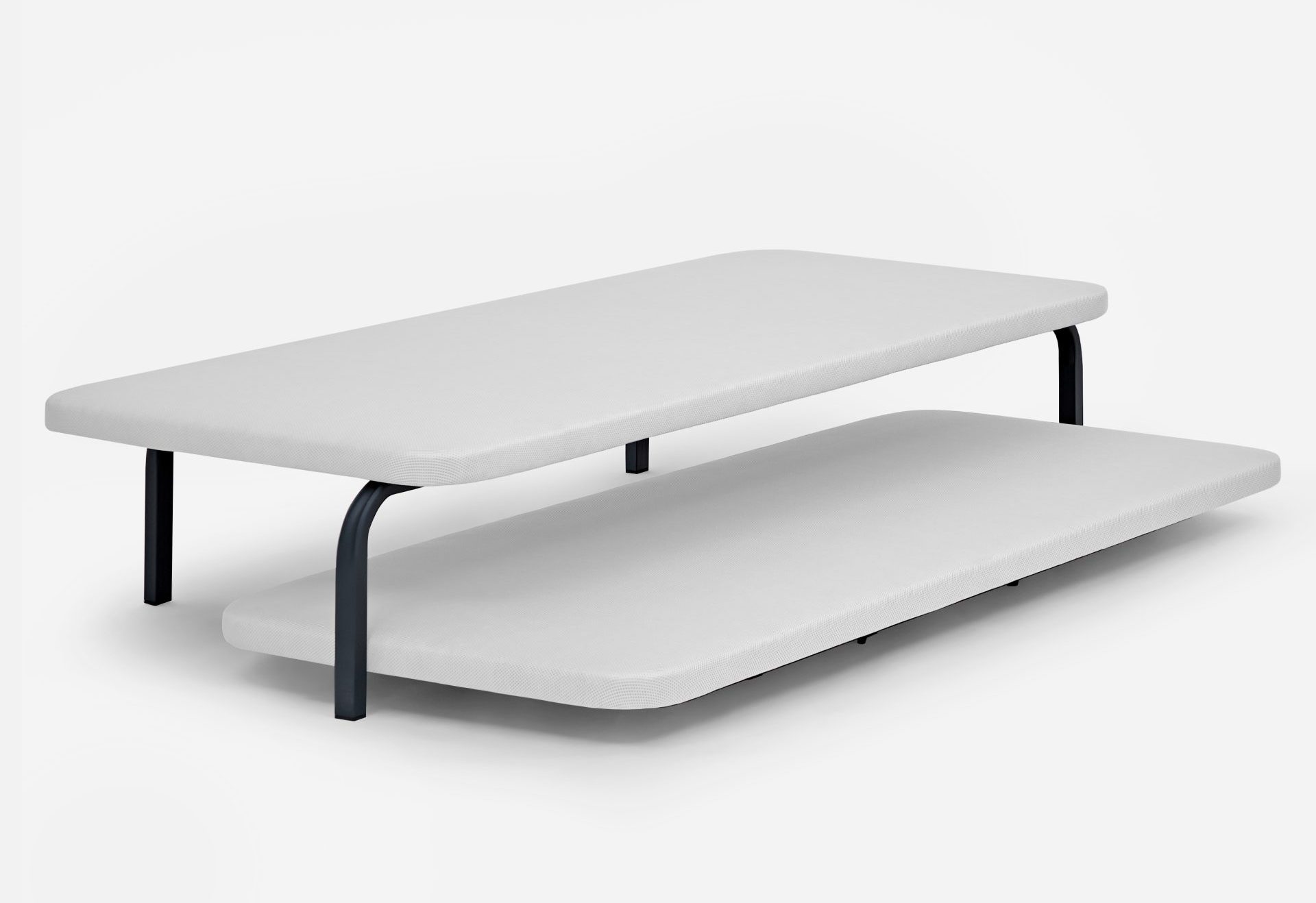 Sobre la estructura descansa un tablero de partículas de alta resistencia de 10 mm de grosor, tapizado en tejido 3D transpirable sobre espuma de 10 mm con una densidad de 20 kg/m³, proporcionando una base estable, cómoda y perfectamente ventilada.