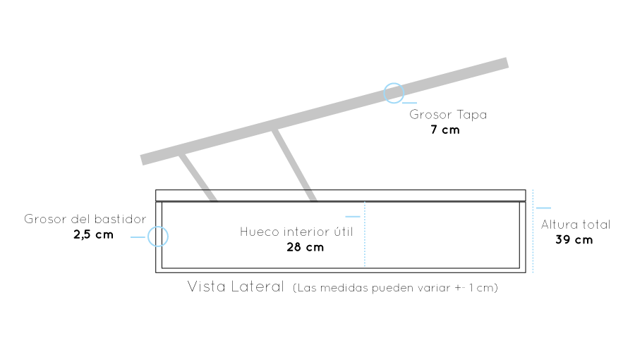 Además, en las medidas que superan los 160cm (incluido) la estructura lleva un tabique en medio sobre el que se colocan otros dos hidráulicos para facilitar la elevación de la tapa. Todas las tapas vienen de serie con tiradores al canto atornillados a la estructura de la tapa para evitar que se suelten cuando levantamos la tapa con el colchón en el día a día.
