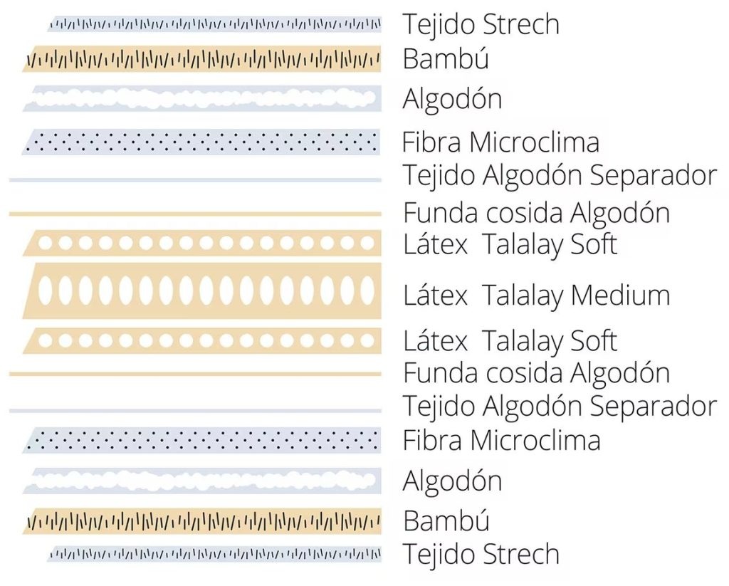 - Talalay 100% natural: alta elasticidad, baja presión, comportamiento higiénico (antibacteriano, antifúngico y antiácaros)